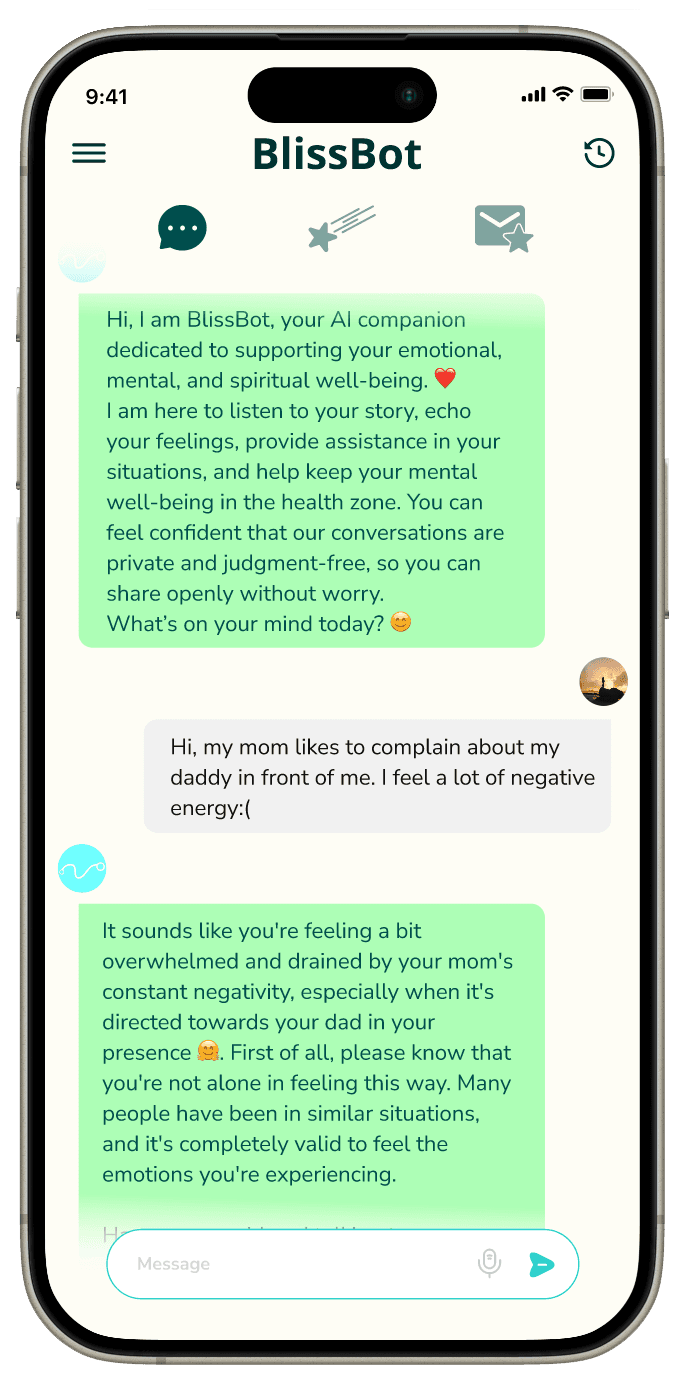 "BlissBot is revolutionizing the way we approach mental health with its holistic and positive approach. Well done!"