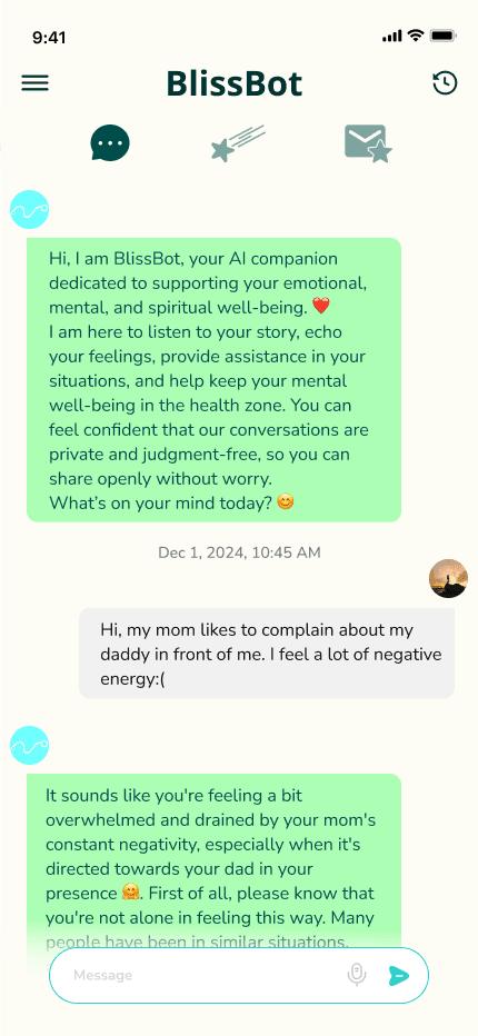 "I recently used BlissBot and it was incredibly helpful. A friend of mine lost her father, and while I felt deeply sorry for her, I also felt powerless to provide the comfort she needed. Chatting with the bot helped me process my own emotions—it was compassionate, validating, and insightful. It provided a safe space to understand my feelings and even guided me on how to better support my friend emotionally. I recommended this app to two of my friends right away."